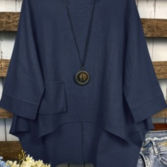 Dipped Hem Solid Blouse, Asymmetrical Crew Neck Loose Casual Blouse, Women's Clothing