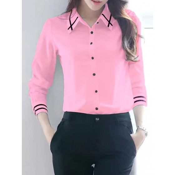 Contrast Trim Button Front Shirt, Casual Long Sleeve Shirt For Spring & Fall, Women's Clothing