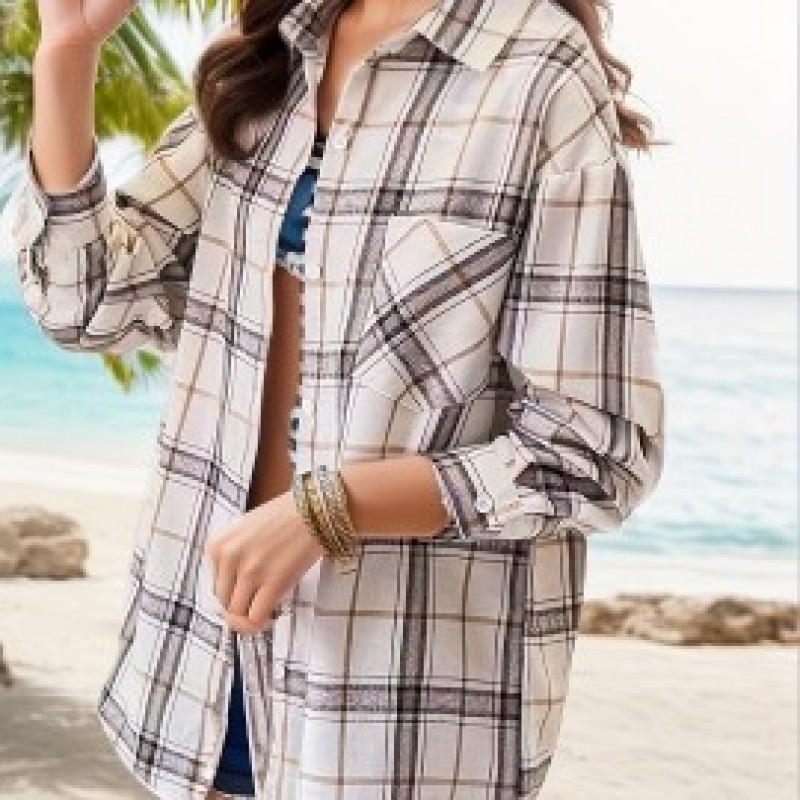 Plaid Pocket Drop Shoulder Shirt, Button Long Sleeve Shirt, Casual Every Day Tops, Women's Clothing