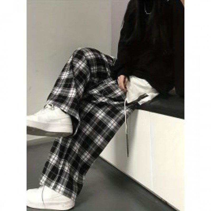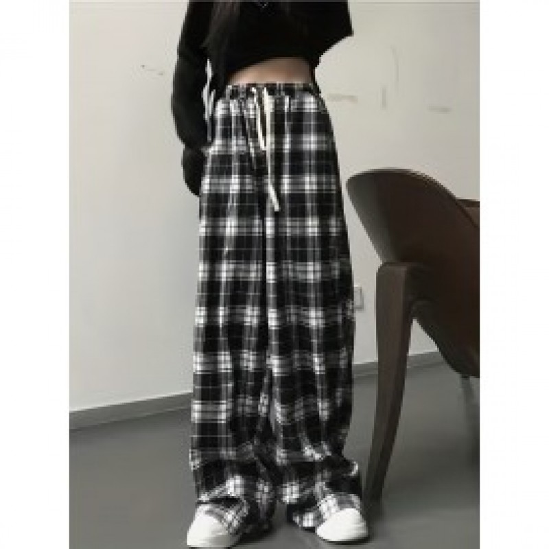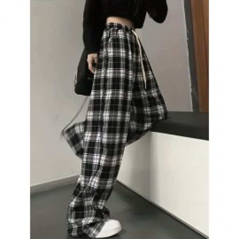 Plaid Drawstring Straight Leg Pants, Casual Loose Pants For Spring & Fall, Women's Clothing