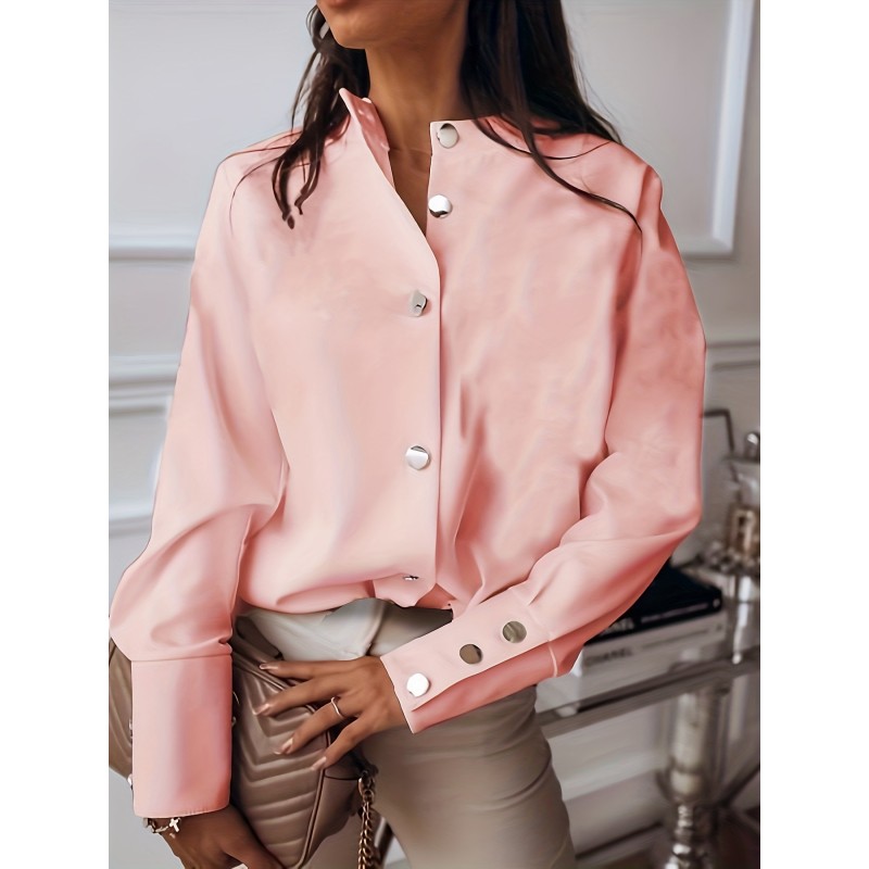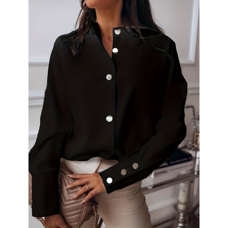 Solid Button Front Blouse, Casual Long Sleeve Versatile Blouse, Women's Clothing