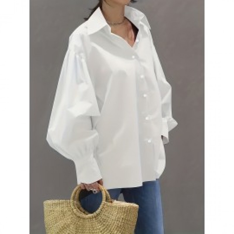 Solid Button Front Shirt, Stylish Lantern Sleeve Shirt For Spring & Fall, Women's Clothing