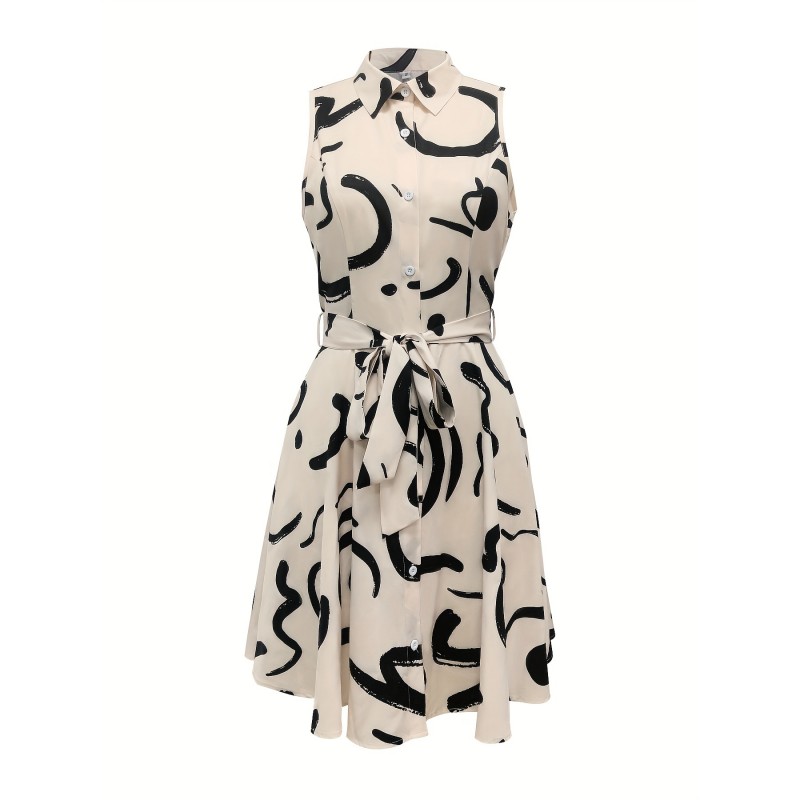 Abstract Print Button Front Sleeveless Dress, Casual Tie-waist Lapel Dress For Spring & Summer, Women's Clothing
